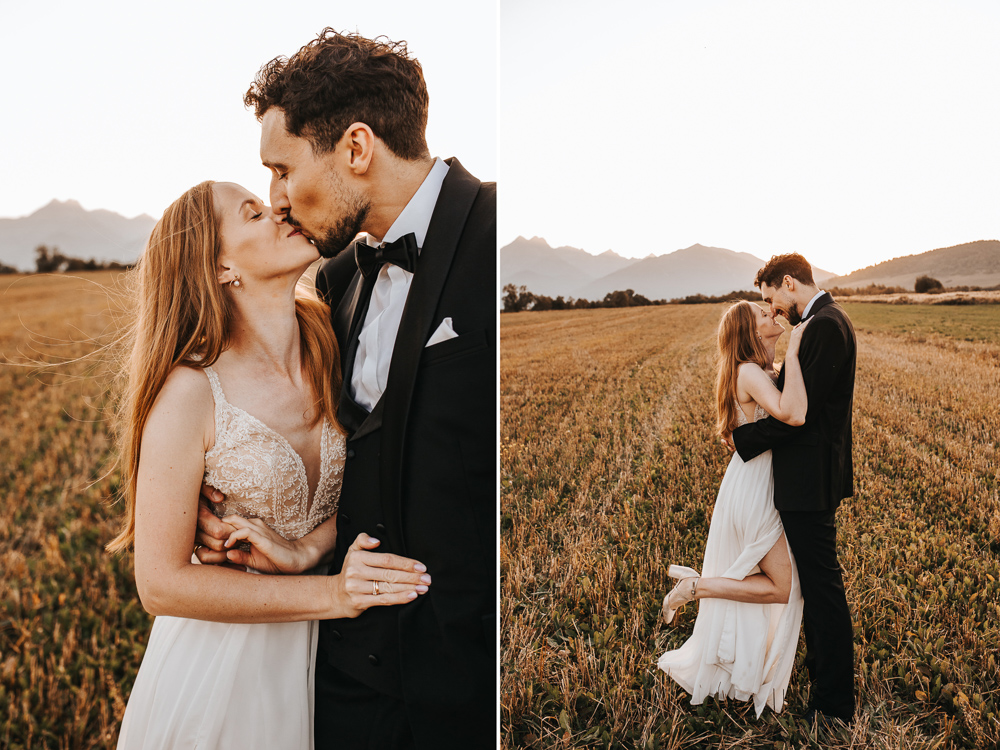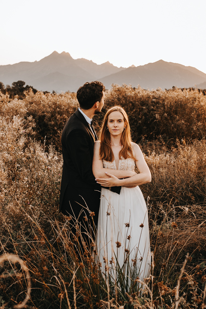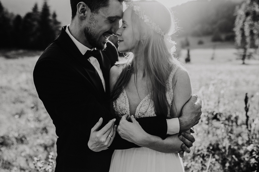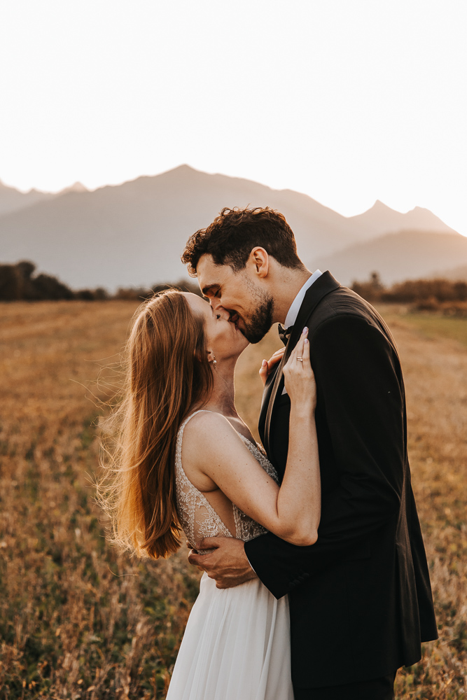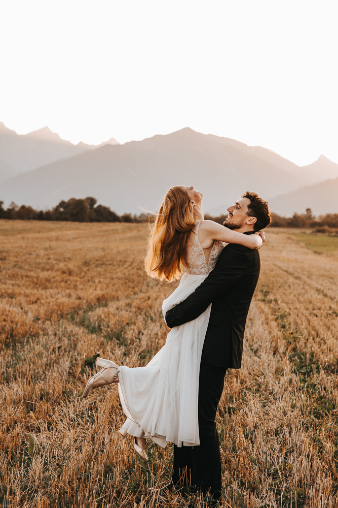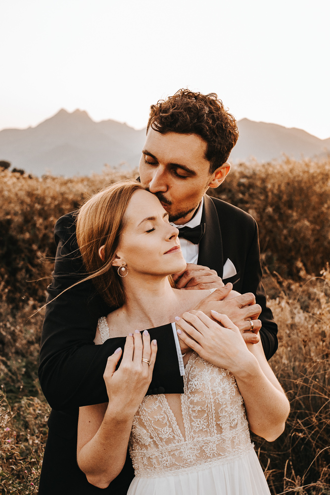 Od samego początku wszystko miało tu świetny rytm. Był luz, dużo śmiechu i naprawdę dobra zabawa, ale obok tego pojawiało się też wszystko to, co w sesjach ślubnych lubię najbardziej. Spojrzenia, bliskość, drobne gesty i ten wyjątkowy moment dnia, kiedy słońce zaczyna chować się za górami. Wtedy nawet najpiękniejszy krajobraz robi się jeszcze bardziej miękki, ciepły i spokojny.