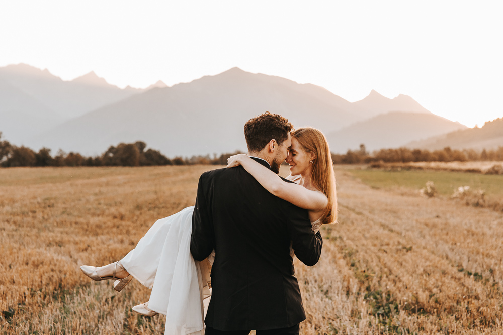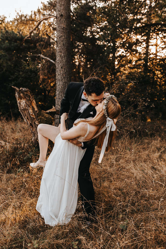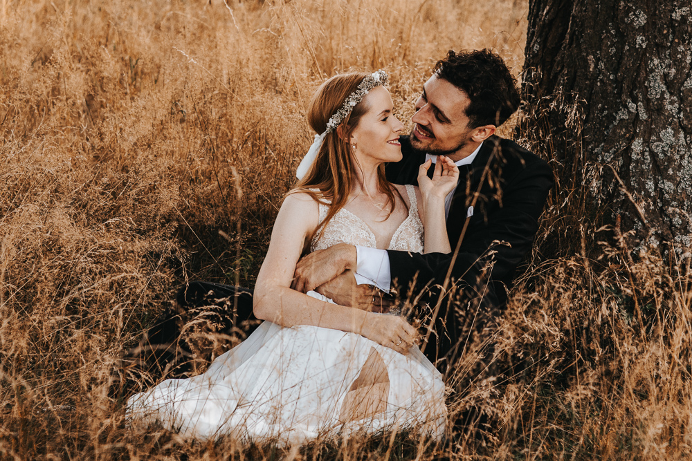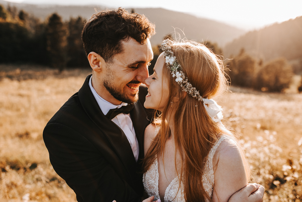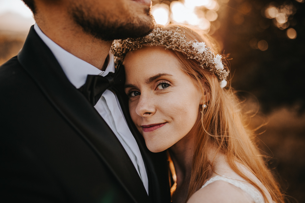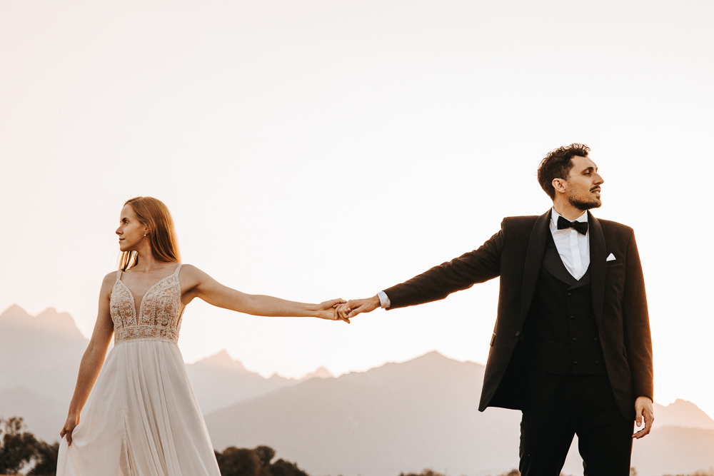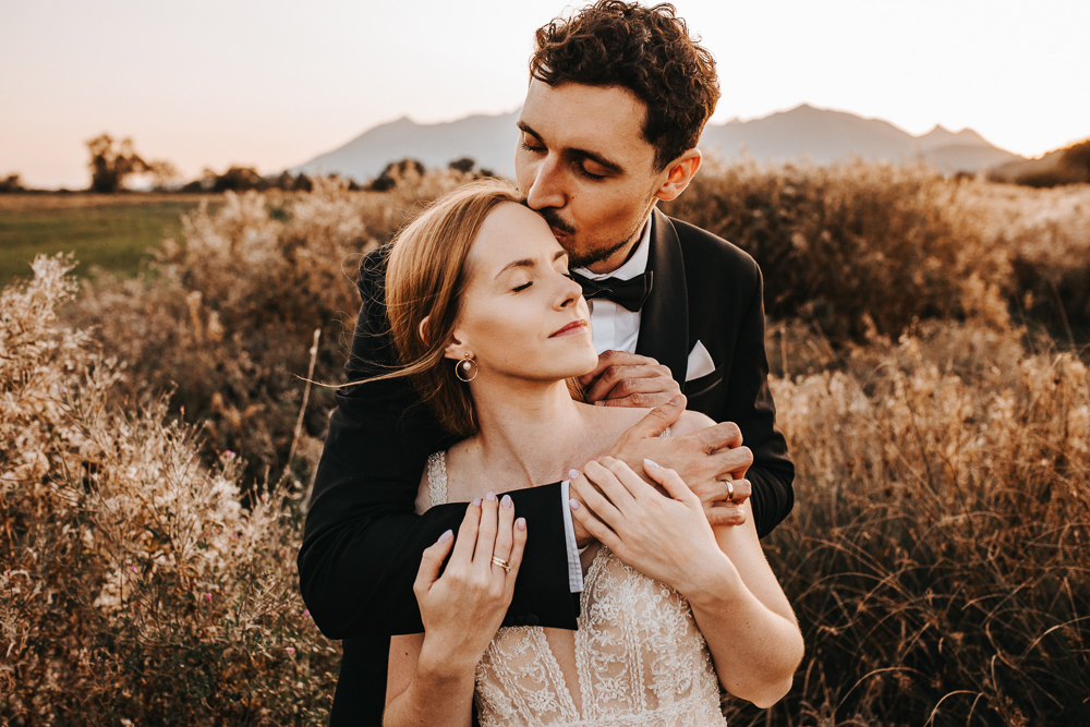 Od samego początku wszystko miało tu świetny rytm. Był luz, dużo śmiechu i naprawdę dobra zabawa, ale obok tego pojawiało się też wszystko to, co w sesjach ślubnych lubię najbardziej. Spojrzenia, bliskość, drobne gesty i ten wyjątkowy moment dnia, kiedy słońce zaczyna chować się za górami. Wtedy nawet najpiękniejszy krajobraz robi się jeszcze bardziej miękki, ciepły i spokojny.